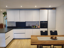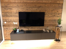 Hochwertige Küche (Arbeitsfläche echter Stein, Kombidampfgarer), Altholzfernsehwand usw.