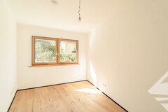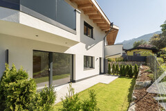 Das Wohnhaus wurde in Massivbauweise unter Nutzung von hochgedämmten und atmungsaktiven Mauersteinen mit Betonkern errichtet. Die sorgfältig ausgewählten Materialien werden bewusst reduziert eingesetzt, um ein homogenes und beruhigendes Erscheinungsbild zu erzielen. Helle Oberflächen im Innen- und Außenbereich unterstreichen die Großzügigkeit des in Vollholz ausgeführten Sichtdachstuhls im Dachgeschoß. Die zum Teil raumhohen Glaselemente mit Flügeltüren erweitern den Wohnraum in die Natur - direkt auf die Terrasse