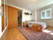 Das historische Gebäude, das im Jahr 1990 zu Wohnungen umgebaut wurde, strahlt mit seiner malerischen Fassade, den grünen Fensterläden und den liebevollen Details eine warme, einladende Atmosphäre aus.