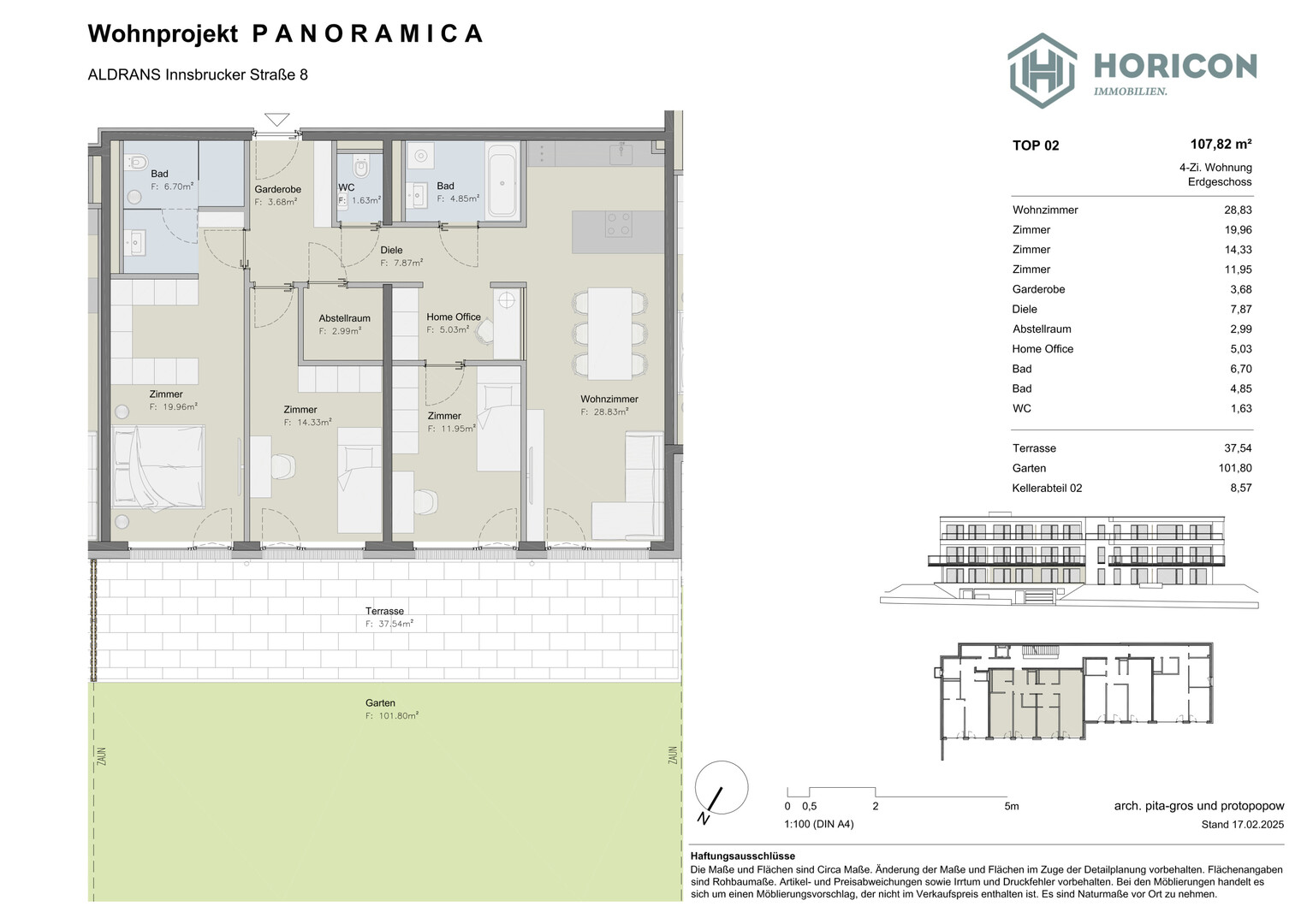 Diese erstklassige und geräumige 4-Zi-Gartenwohnung Top W02.1 bietet auf 107,82 m² Wohnfläche alles, was Sie sich von einem modernen Zuhause wünschen – ergänzt durch eine herrliche Terrasse von über 37 m² sowie einen großen Garten mit über 101 m², die Ihnen einen unvergleichlichen Ausblick auf Innsbruck und die Nordkette bieten. Ergänzt wird die Einheit auch durch einen eigenen Home-Office Bereich, um auch zu Hause arbeiten zu können. Der Wohnbereich wird durch die perfekte Kombination aus Eleganz, modernster Technik und Funktionalität abgerundet.