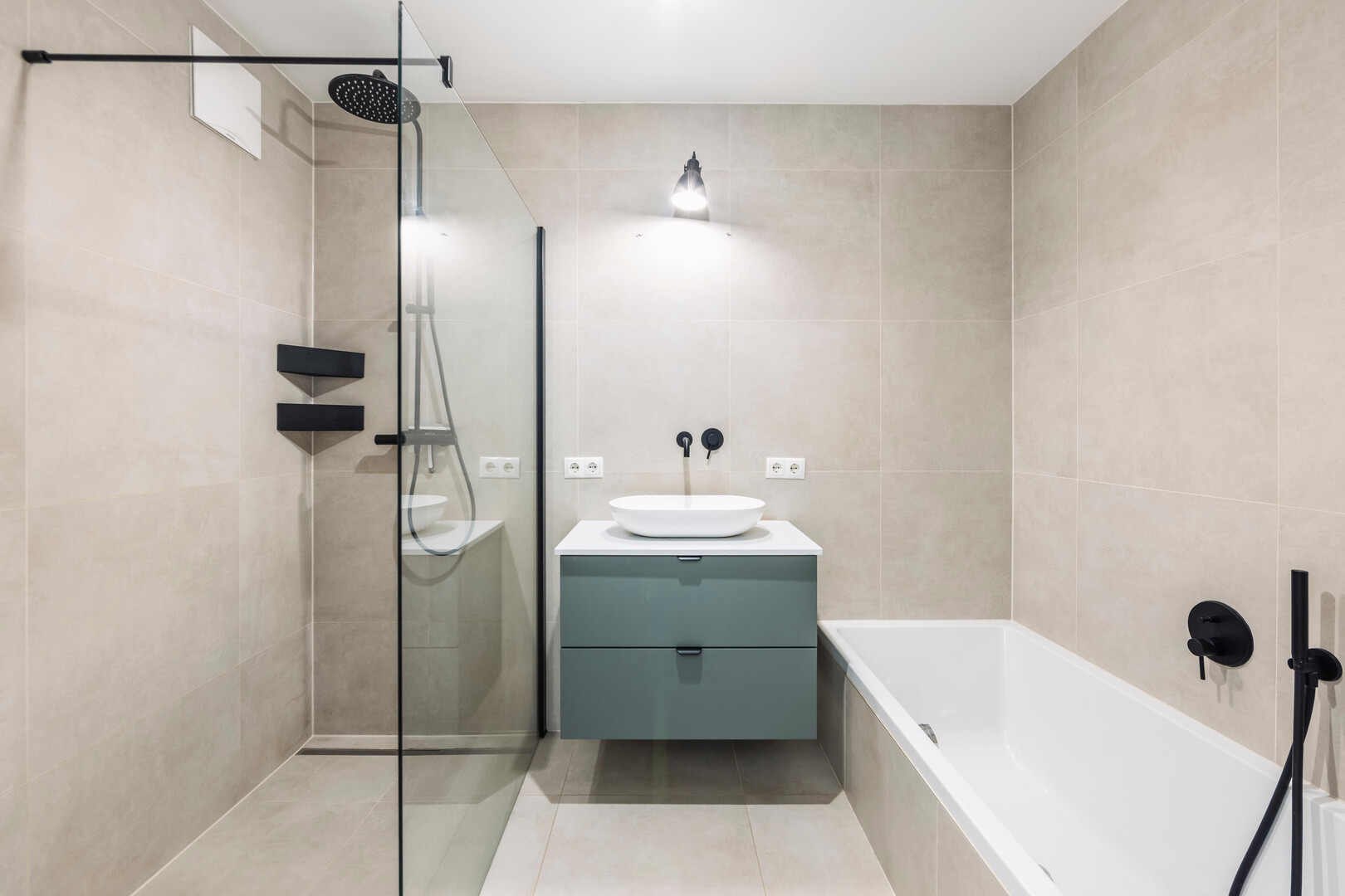 - modernes Badezimmer mit Badewanne und separater Dusche; getrenntes WC mit Einbaumöbeln