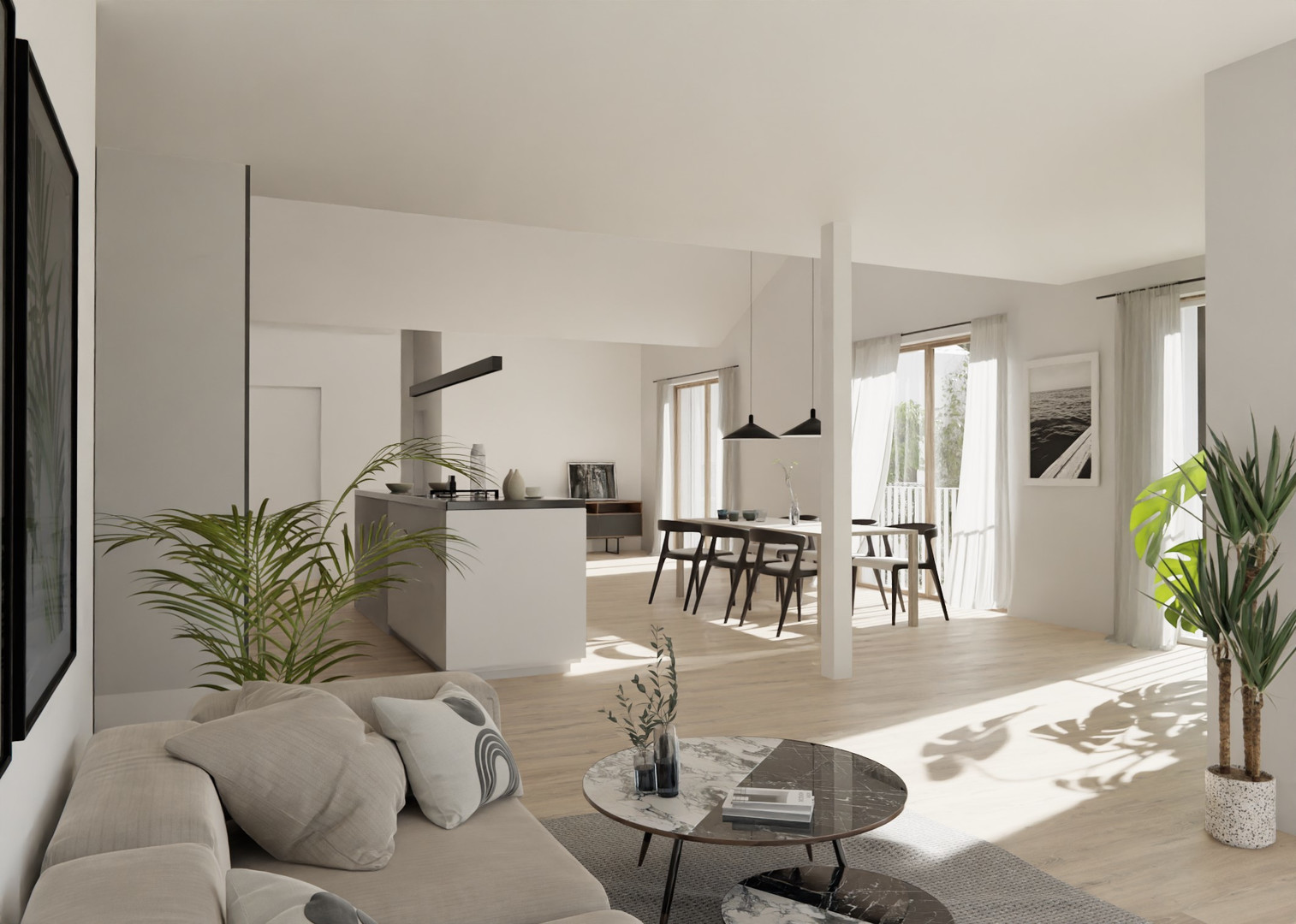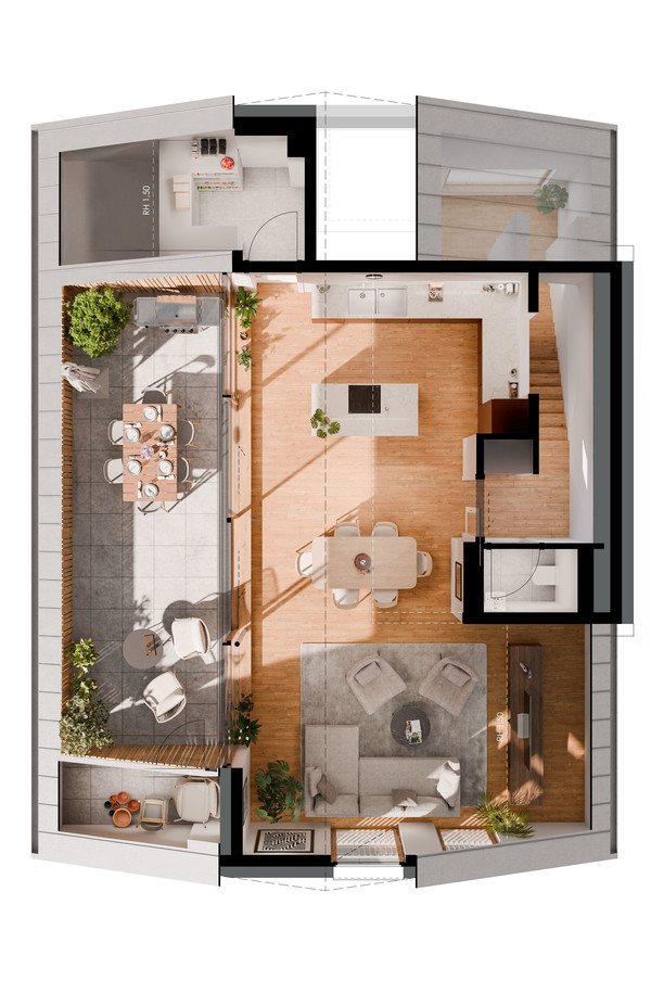 Im Unter- und Erdgeschoss ist der Baukörper verbunden, ab dem 1. Obergeschoss teilt er sich in 2 separate Gebäude und eröffnet daher, gerade für die Penthouses, die nötige Intimität und Uneinsichtigkeit die man sich wünscht.