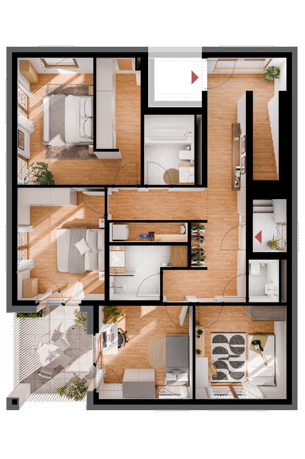 Diese prächtige zweistöckige Wohnung verteilt sich auf 194 m² Wohnfläche. Die Hauptebene mit breiter Südausrichtung wird neben dem grandiosen Wohn-Essbereich mit 4 Zimmern und 2 Bädern sowie 3 Loggien und Nebenräumen bespielt. Die Galerie eröffnet einen privaten Bereich mit Dachterrasse, der sich bestens für zB. Fitness- oder Zubereich zur großen 20m² Dachterrasse anbietet.