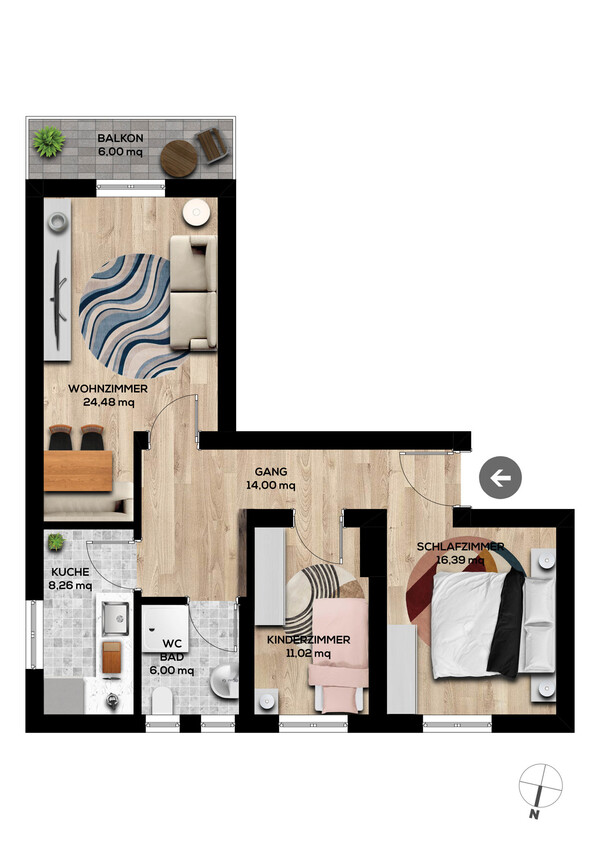 Bei der auf den Fotos dargestellten Möblierung handelt es sich nur um einen Vorschlag, die Wohnung ist unmöbliert.