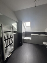 ein großzügiges, modern ausgestattetes Badezimmer mit Tageslicht über ein Dachflächenfenster,