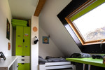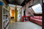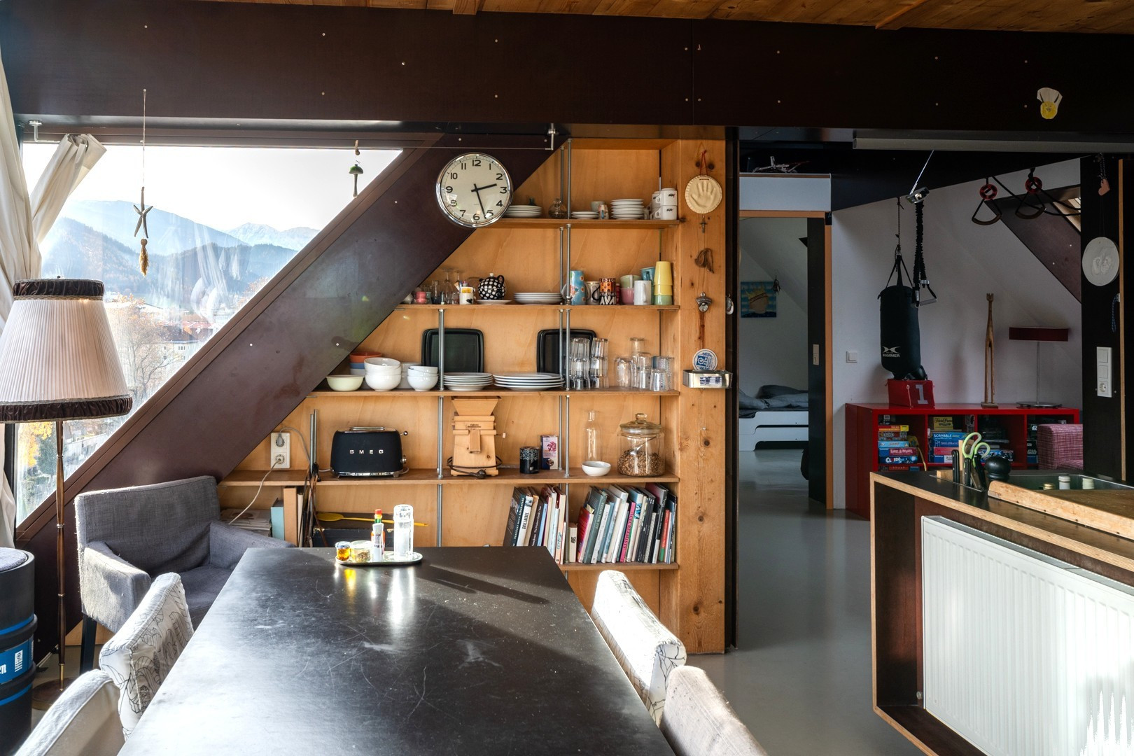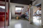 Im 6. und obersten Geschoß angekommen - ohne Lift - eröffnet sich eine designte Architektenwohnung: viele Dachschrägen, spannende Raumformen und einem Grundriss, der nicht “von der Stange”, sondern von kreativen Köpfen gemacht wurde.