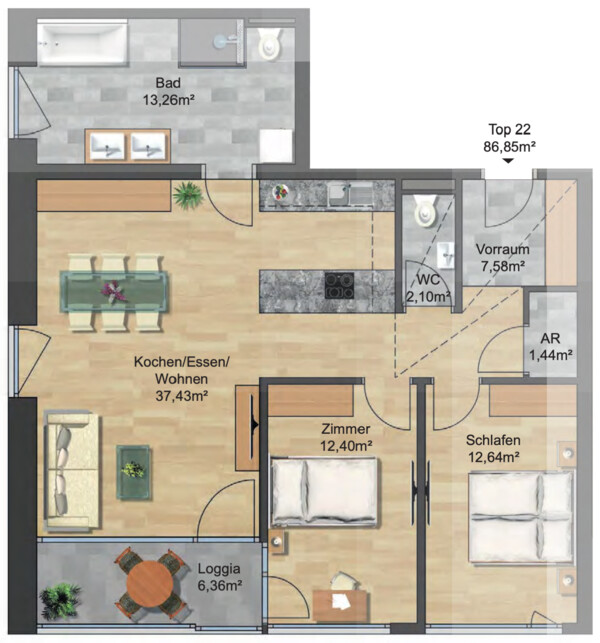 Die Wohnung befindet sich im 2. Obergeschoss eines im Jahr 2024 fertiggestellten Mehrparteienhauses und verfügt über eine Wohnfläche von ca. 86 m² sowie eine westseitig ausgerichtete Loggia mit 6,36 m². Die optimale Raumaufteilung bietet ein großzügiges Wohn-Esszimmer mit großer Glasfront und moderner Einbauküche, zwei Schlafzimmer, ein großzügiges Badezimmer, ein separates WC sowie einen praktischen Abstellraum.