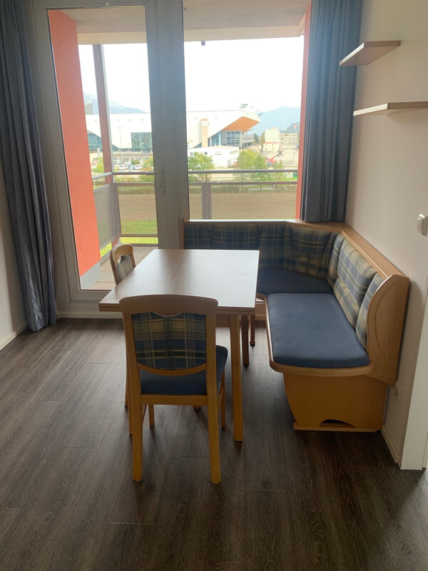Der Wohn-/Essbereich mit integrierter Küche ist offen gestaltet und bietet direkten Zugang zum Balkon mit Blick ins Grüne und auf die umliegende Bergwelt. Die vorhandene Einbauküche ist funktional ausgestattet (E-Herd mit Kochfeld, Backofen, Geschirrspüler, Kühlschrank, Dunstabzug) und verfügt über einen praktischen Bartisch. Ein Esstisch mit Eckbank ist ebenfalls vorhanden.