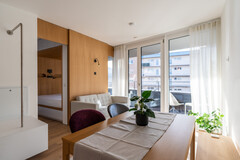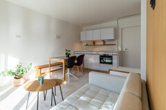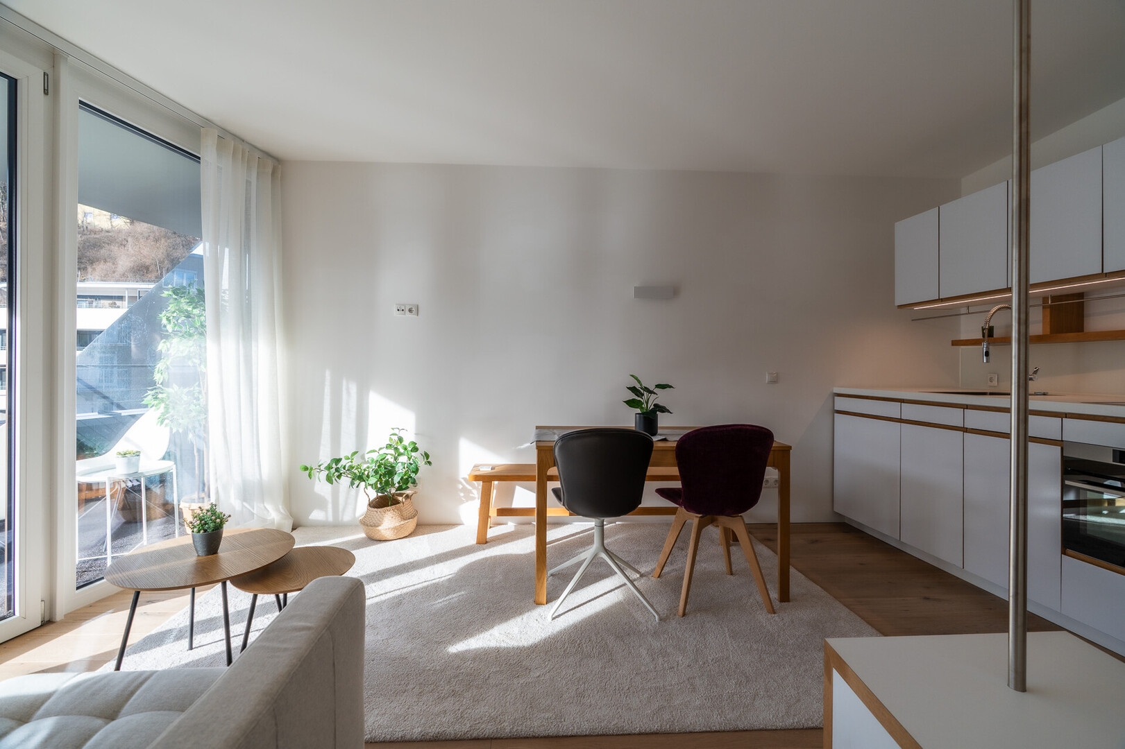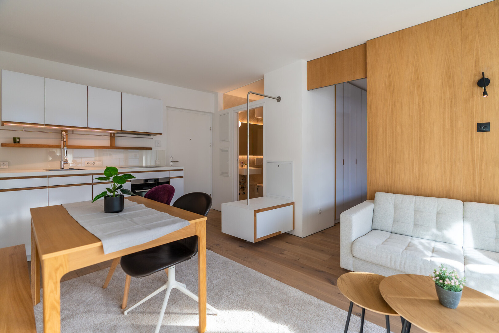 Der offen gestaltete Wohn-/Essbereich mit maßgefertigter Tischlerküche wirkt klar, hochwertig und zugleich wohnlich. Bodentiefe Fenster holen das Tageslicht tief in die Wohnung, während der warme Massivholzboden für eine angenehme Atmosphäre sorgt. Das voll möblierte Schlafzimmer (inkl. Staufläche unter- und über dem Bett + Einbauschrank) sowie das elegant ausgeführte Designerbad runden das stimmige Gesamtkonzept ab.