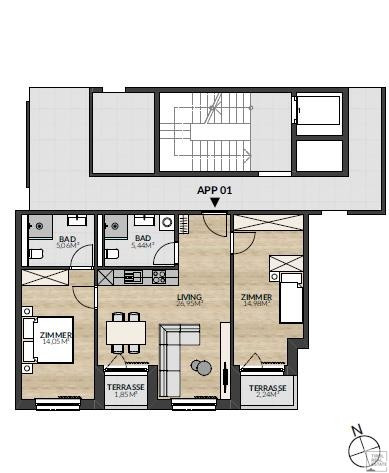 Das Apartment 01 erstreckt sich über 66,48 m² im Erdgeschoss der exklusiven Fiss Residences. Die durchdachte Raumaufteilung sorgt für maximalen Komfort und bietet ausreichend Platz für bis zu fünf Personen.