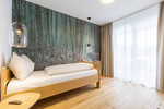 •Schlafzimmer: Zwei stilvoll eingerichtete Zimmer mit Boxspringbett, Einzelbett, geräumigem Eichholzfunier-Kleiderschrank und stilvollen Tapeten. Jedes Schlafzimmer bietet direkten Zugang zu einer der zwei Terrassen mit traumhaftem Bergblick.