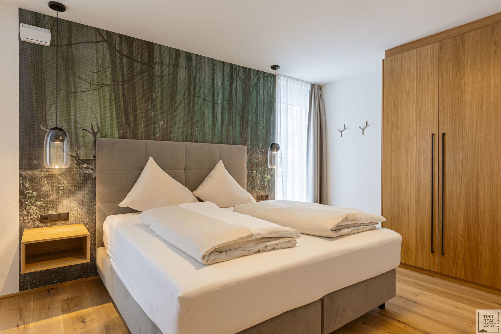 •Schlafzimmer: Zwei stilvoll eingerichtete Zimmer mit Boxspringbett, Einzelbett, geräumigem Eichholzfunier-Kleiderschrank und stilvollen Tapeten. Jedes Schlafzimmer bietet direkten Zugang zu einer der zwei Terrassen mit traumhaftem Bergblick.
