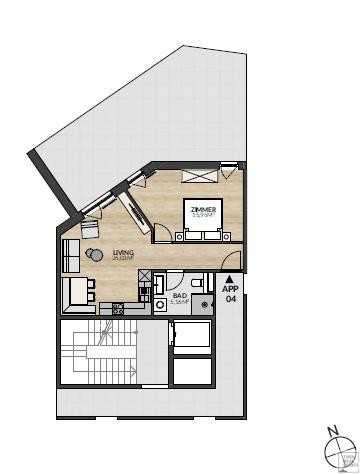 Das Apartment 04 befindet sich im Erdgeschoss und erstreckt sich über eine Wohnfläche von 44,61 m². Die durchdachte Raumaufteilung bietet höchsten Wohnkomfort: