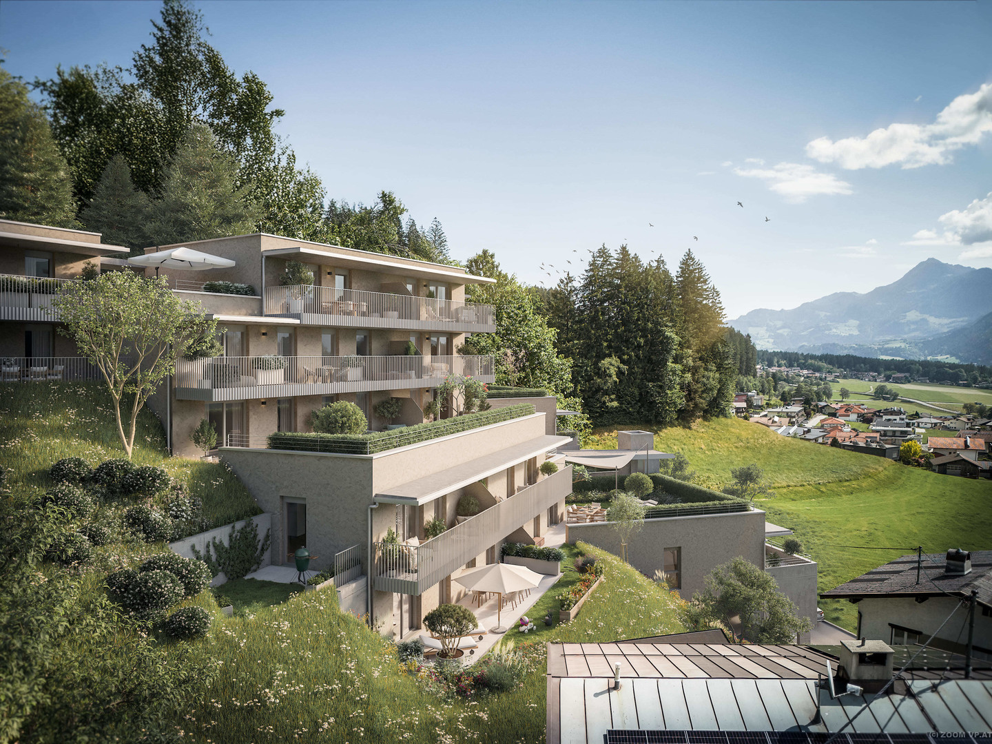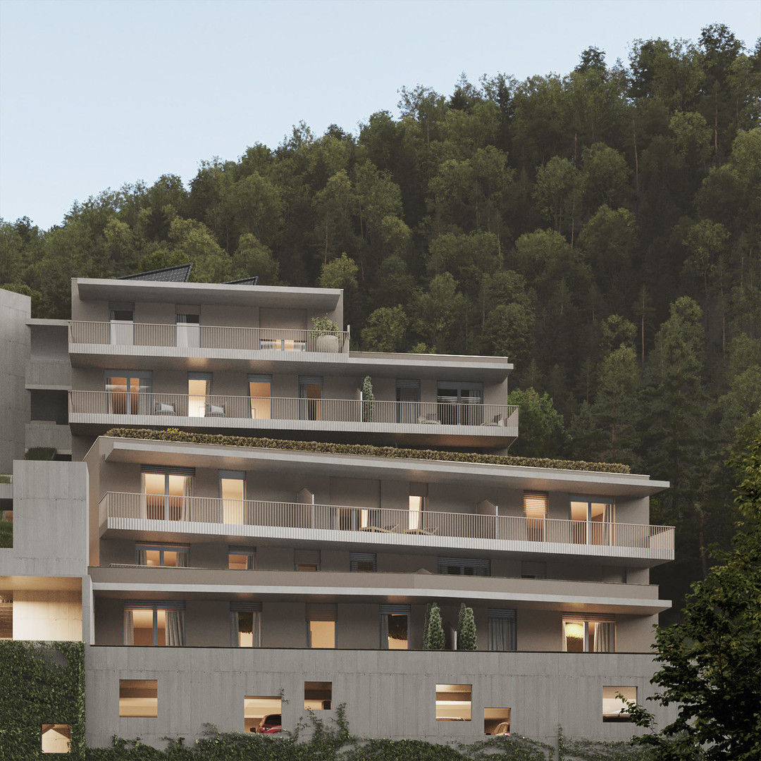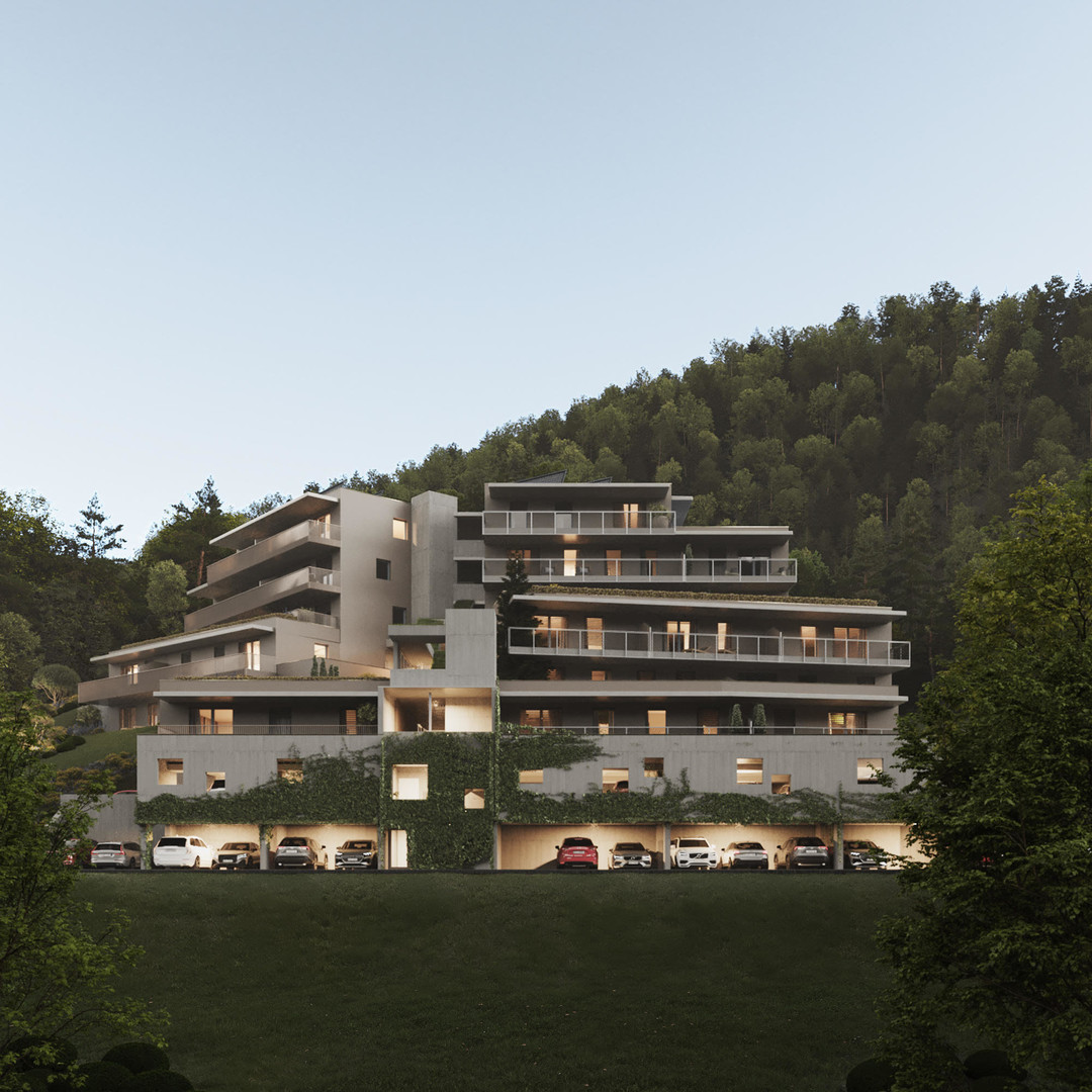 Das Projekt umfasst insgesamt 25 Wohnungen, die sich entlang des Hanges verteilen. Die Terrassen der Anlage garantieren einen wunderbaren Blick und sonnige Stunden. Alle Wohnungen sind mit Freiflächen in Form von Terrassen oder Balkonen ausgestattet. Der Baukörper passt sich an die umgebende Topografie an und ermöglicht so auch in den oberen Geschoßen private Gartenflächen. Die Anlage punktet mit Wohnkomfort und hoher Qualität der Ausstattung: Echtholz-Parkettböden im gesamten Wohnbereich sowie großformatige Fliesen in den Bädern und WCs. Wärmedämmende 3-Scheiben-Isolierverglasung, ausreichende Stromanschlüsse und ein Personenaufzug runden dieses Angebot ab. Hervorzuheben ist ebenfalls, dass das angewandte Heizungssystem auch in den Sommermonaten eine sanfte Kühlung über die Fußbodenheizung ermöglicht.