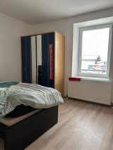 Das helle Schlafzimmer bietet genügend Platz für ein großes Bett sowie Stauraum und schafft einen angenehmen Rückzugsbereich.