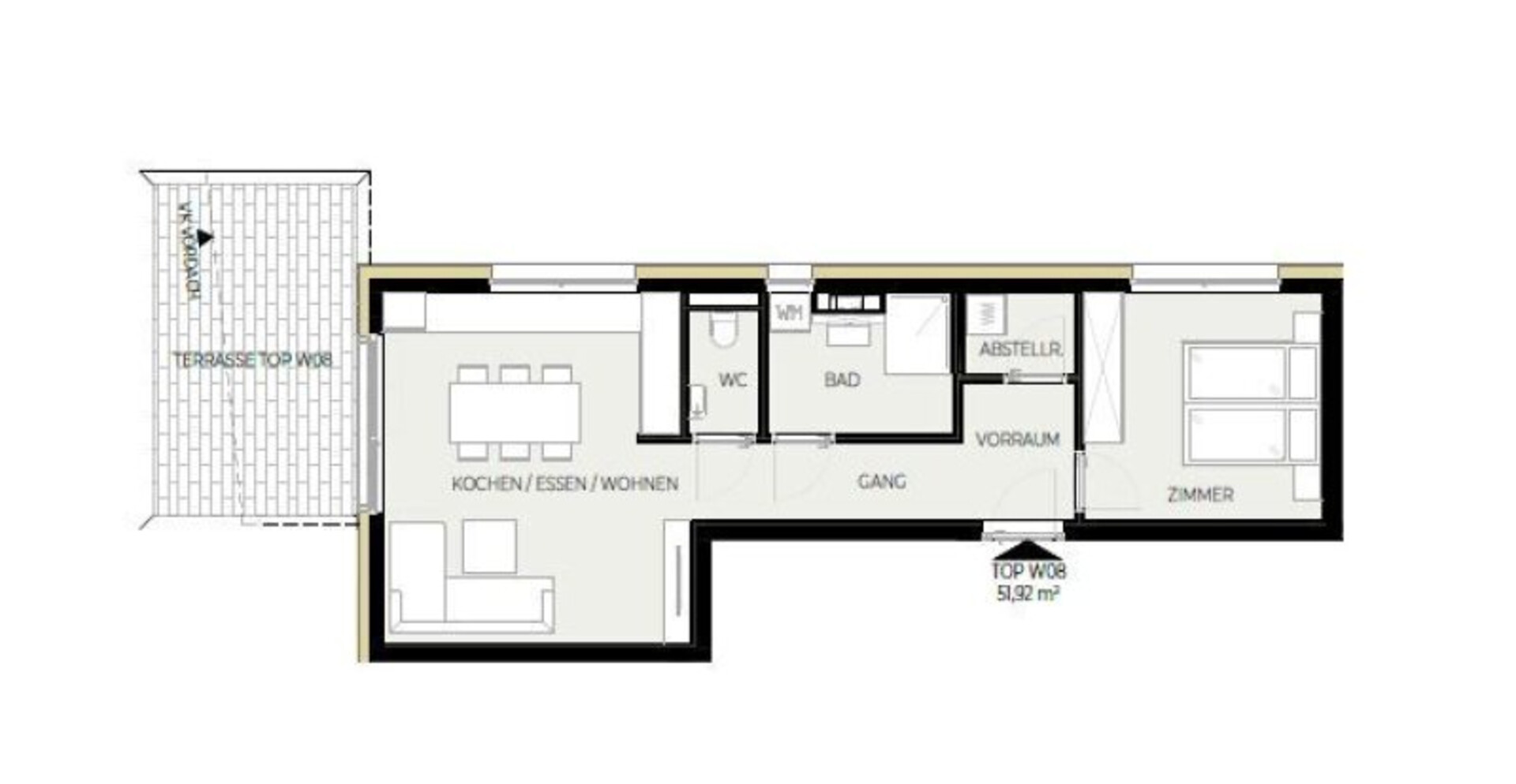 Ebene 2 | Top W08: 2 Zimmerwohnung mit 51,92 m² Wohnfläche und 14,64 m² Terrasse