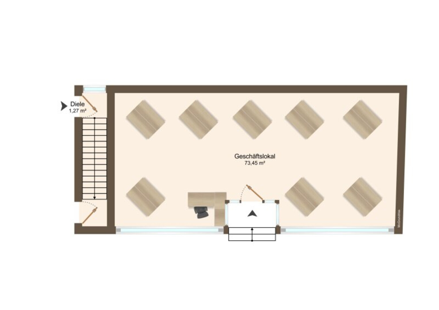 Auf ca. 73,50 m² im Erdgeschoss hat man die Möglichkeit den gewerblichen Raum für eine Arztpraxis, Büro- oder Geschäftsräumlichkeit zu nutzen. Durch die große Fensterfront bietet sich genügend Platz, Ihre Produkte optimal zu präsentieren.