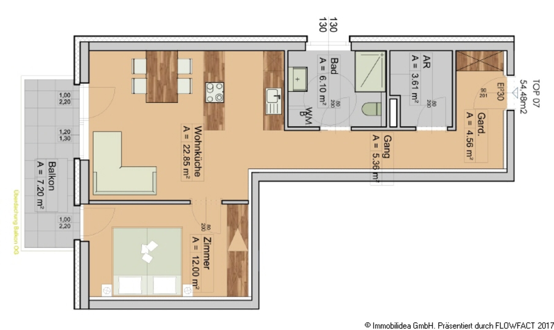 Die Wohnung 7 in der Wohnanlage in Schwaz umfasst eine Garderobe, einen Gang, eine Wohnküche, ein Schlafzimmer, ein Bad, einen Abstellraum und einen Balkon (7,20 m²). Die Gesamtfläche der Wohnung beträgt 54,48 m².
