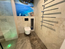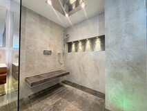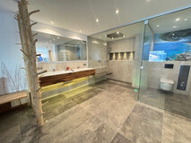 Das hochwertig ausgestattete Badezimmer besticht durch modernes Design, klare Linien und qualitative Materialien.