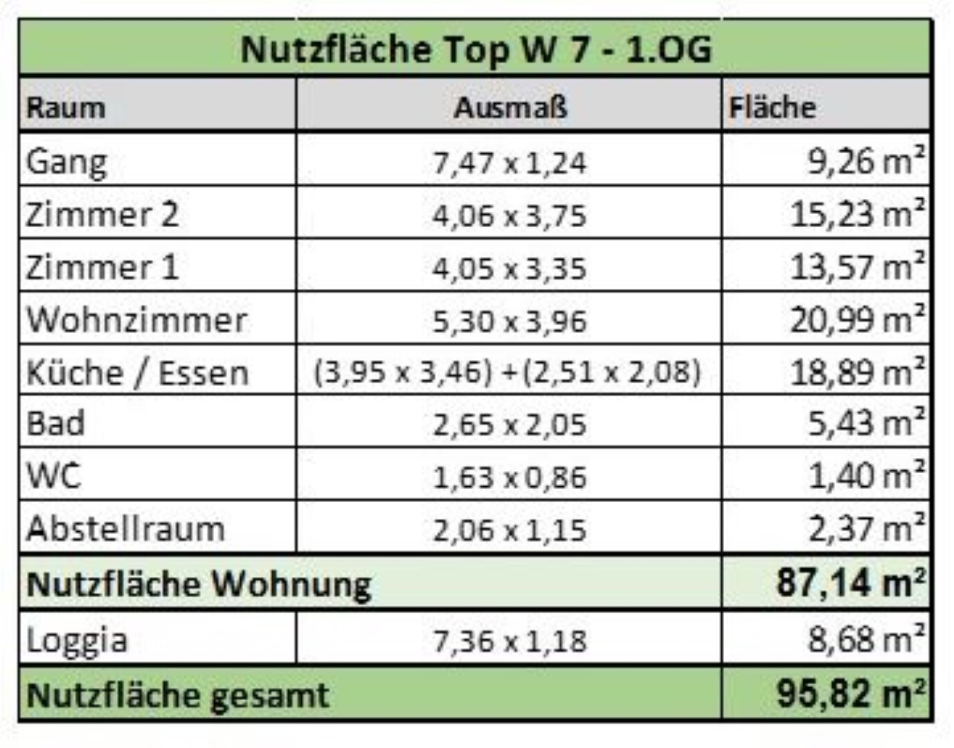 Die Wohnung wurde ausgemessen (siehe Grundrissplan und Nutzflächenaufstellung) und ergab sich inklusive Loggia eine Gesamtfläche von 95,82 m2, wofür jedoch ausdrücklich keine Haftung übernommen wird.