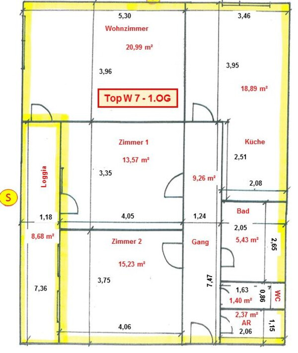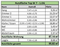 Laut Beschluss zur Festsetzung der Jahresmietwerte des Bezirksgerichtes Schwaz vom 10.12.1965 besteht die Wohnung W 7 aus drei Zimmern, Wohnküche, Bad, WC, Abstellraum, Flur und Loggia mit einer Gesamtfläche von ca. 100,30 m2.
