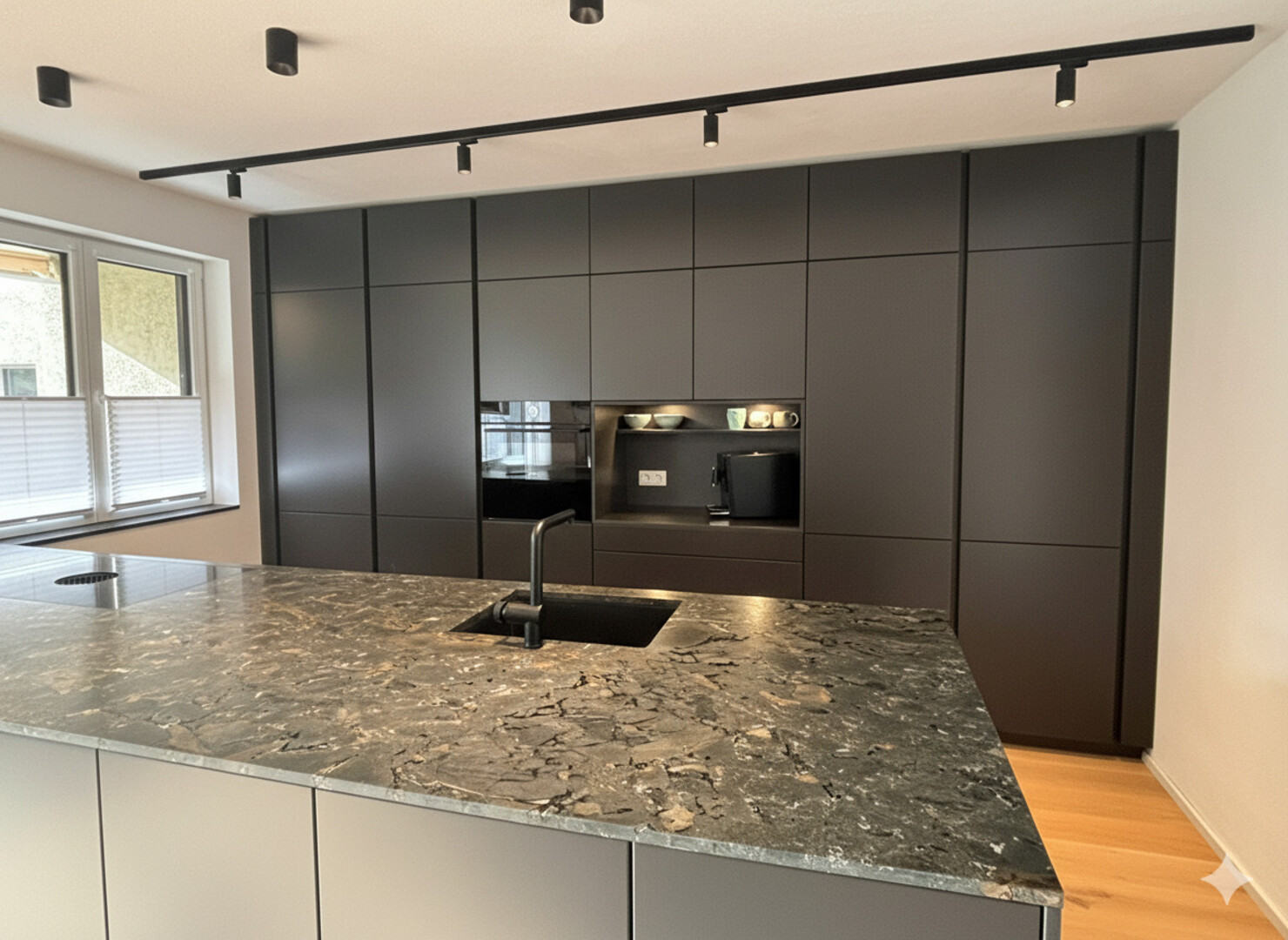 DAN-Designerküche mit Bora Umluftsystem und Boschgeräten, Arbeitsplatte aus Naturstein, Kombigerät aus Backofen und Dampfgarer, Kühl- und Gefrierschrank, Flächeninduktionskochfeld , Dunstabzug, Geschirrspüler, Abwaschbecken.