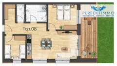 Das Top 8 im Erdgeschoss des Haus 2 umfasst ca. 71 m² und bietet einen hellen Wohn-Essbereich mit Küchenzeile, zwei Schlafzimmer, ein Bad mit Regendusche und WC, ein separates WC sowie eine Terrasse mit Gartenanteil.