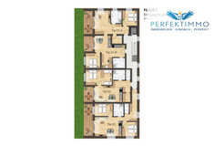 Die Top 3 im Erdgeschoss des Haus 1 umfasst ca. 67 m² und bietet einen hellen Wohn-Essbereich mit Küchenzeile, zwei Schlafzimmer, ein Bad mit Regendusche und WC, ein separates WC sowie eine Terrasse mit Gartenanteil.