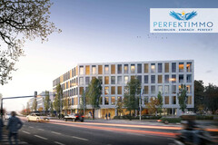 Der Neubau besteht aus einem architektonisch klar gestalteten Gebäudekomplex mit zwei Hauptgebäuden, die sich eine gemeinsame Garage teilen. Während eines der Gebäude in naher Zukunft als Hotel ausgeführt wird, befindet sich im zweiten Baukörper, der bereits in Errichtung ist, ein Wohn- und Geschäftsgebäude, in dem die hier angebotenen Wohnungen und Büroflächen ab Juli 2026 zur Vermietung stehen. Dieses Gebäude gliedert sich in zwei in ihrer Höhe abgestufte Baukörper. Der größere Teil beherbergt Wohn-, Büro- und Geschäftseinheiten, während im angrenzenden Bereich eine Halle zur gewerblichen Nutzung vorgesehen ist. Ein moderner, behindertengerechter Aufzug verbindet sämtliche Ebenen miteinander und sorgt für eine komfortable Erreichbarkeit aller Bereiche.