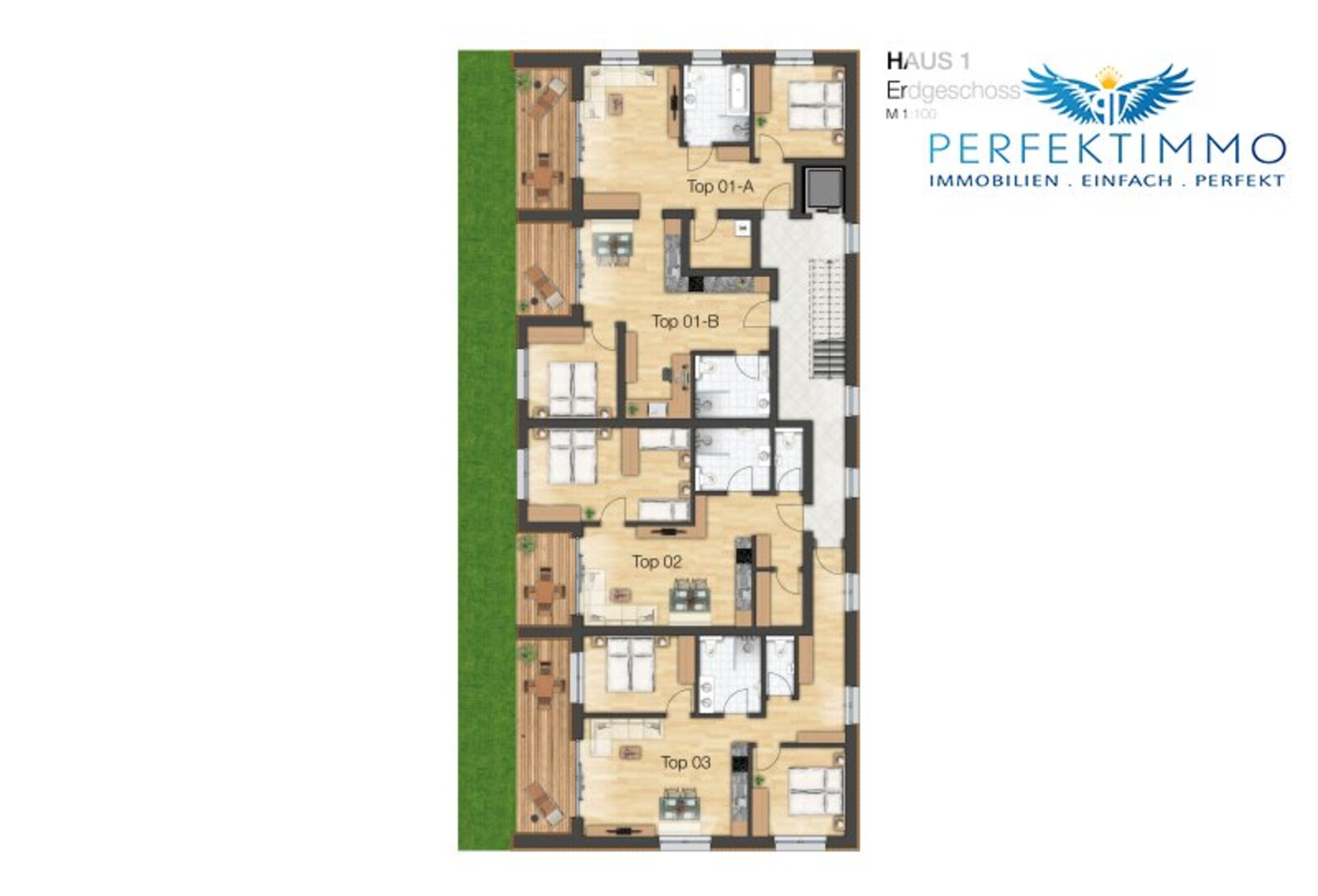 Die Top 2 im Erdgeschoss des Haus 1 bietet auf rund 54 m² einen hellen Wohn-Essbereich mit Küchenzeile, Schlafzimmer, Bad, Abstellraum sowie eine Terrasse mit Gartenanteil.